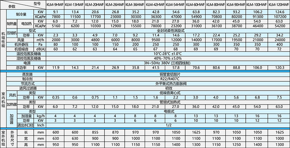 注: 1、設計工況:干球溫度27℃,濕球溫度21.2℃。最大負工況:干球溫度32℃,濕球溫度23℃。